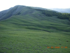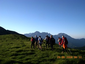 Πράγματι στις 5:30πμ όλοι στο πόδι και αναχώρηση από τη διασταύρωση στο διάσελο στις 6:20πμ. Το μονοπάτι ξεκινάει με ανηφόρα, μέσα από τις αραιές οξιές στην αρχή και την πυκνή βλάστηση, με κατεύθυνση νοτιοανατολικά. Ανεβαίνουμε στην πρώτη κορυφή, την κορυφή 1713, απέναντι από το καταφύγιο. Συνολικά η διαδρομή έχει δεκατρία γεωγραφικά υψομετρικά, άρα δεκατρείς κορυφές.